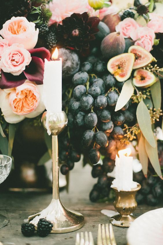 - Imagine an autumnal feast set upon dark wooden banquet tables. Long brass candlesticks entwined with eucalyptus leaves and foliage. Black china plates and jewel tone vintage glassware. Brides with striking purple and blush peony crowns. Cakes that are deliciously drizzled with seasonal fruits. Statement flowers and pampas grass decorate the aisles and festoon lights create the perfect evening ambience.